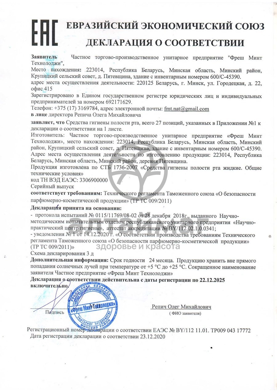 Вода, глицерин/сорбитол, пропиленгликоль, ПЭГ-40, спирт этиловый ректификованный, ароматизатор, ментол, сахаринат натрия, триклозан, ментил лактат, лимонная кислота, бронопол. Объёмная доля этилового спирта не более 0,5%Способ применения